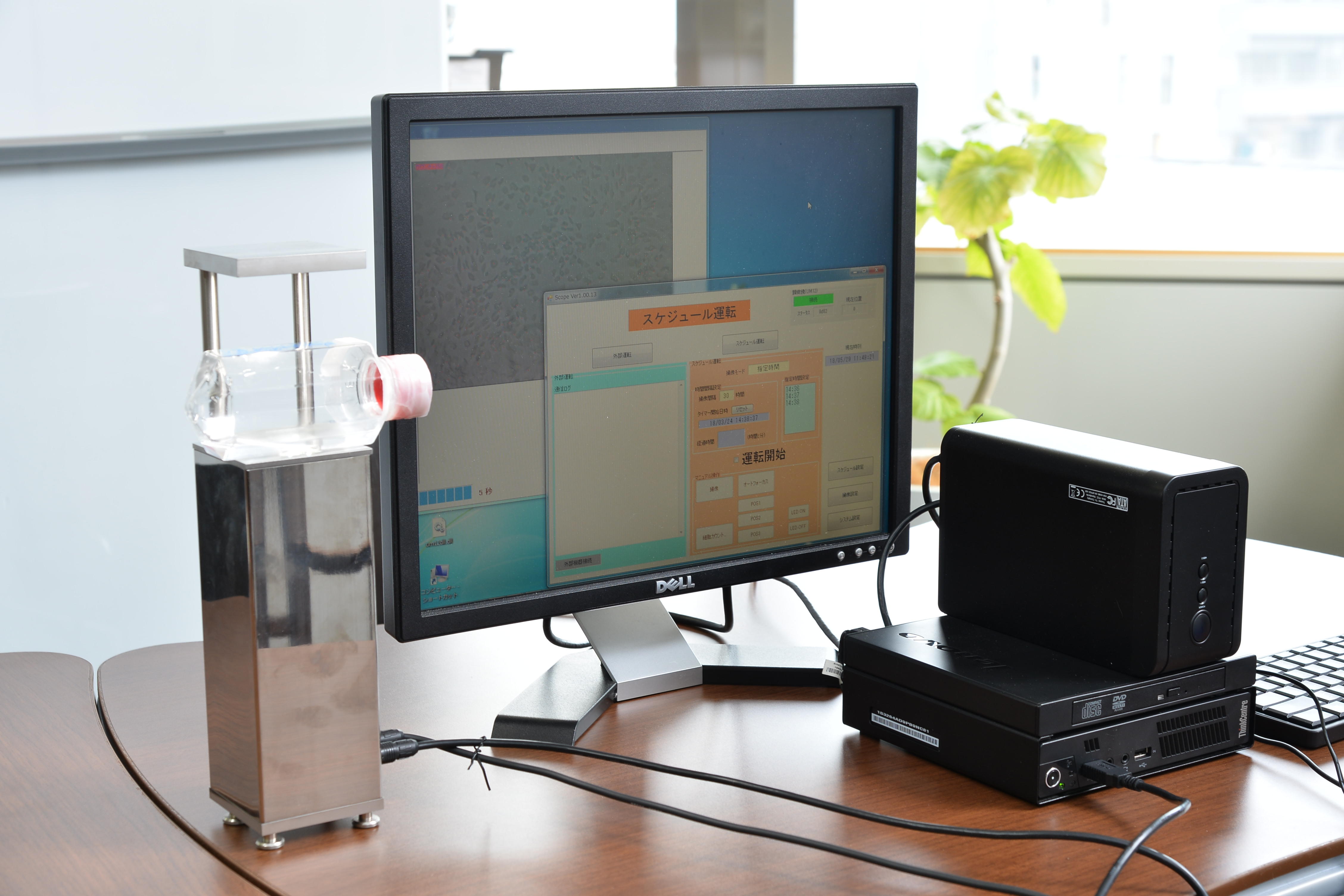 細胞観察装置。webシステムやタイムラプスなどの機能を搭載しながらも安価で小型なのが特徴