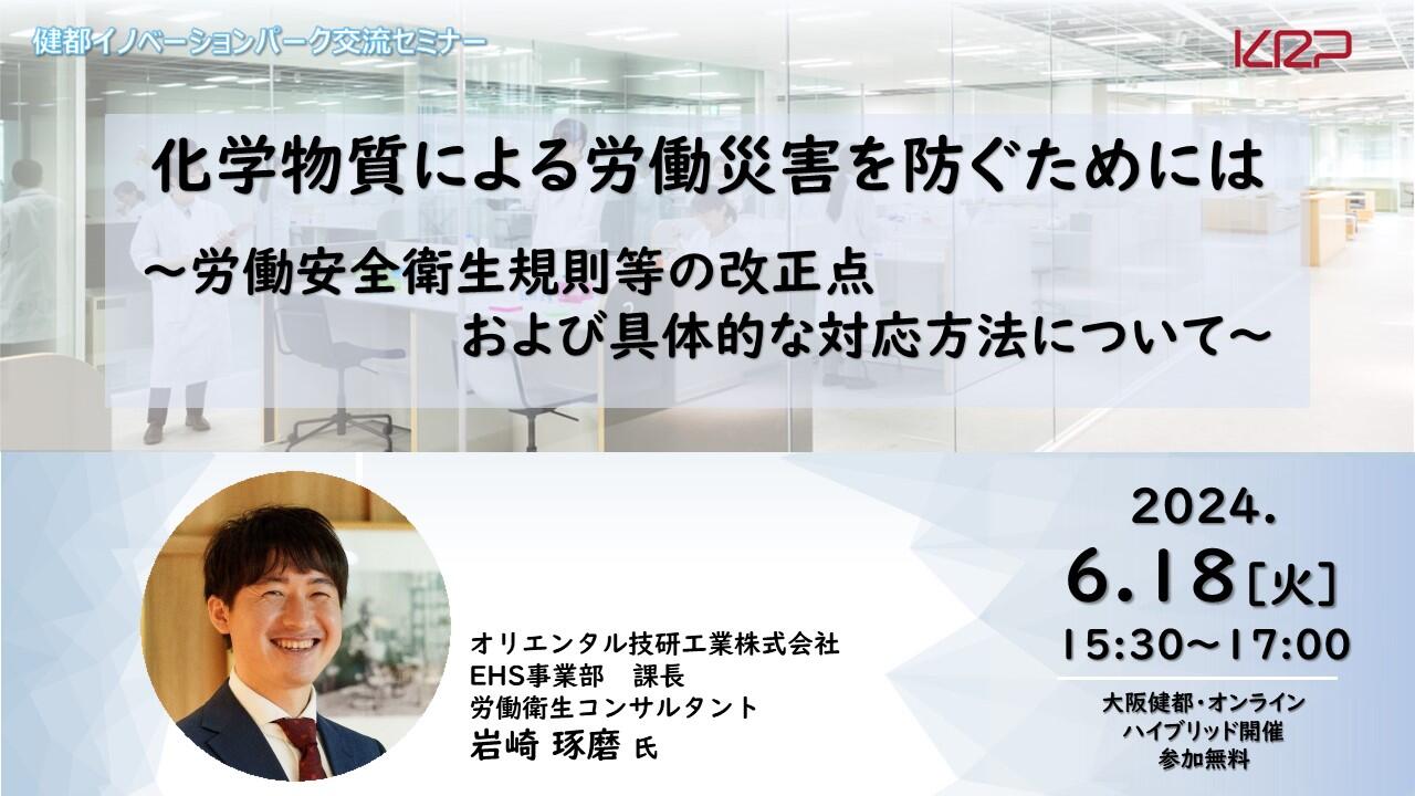 2024年6月18日(火)に、健都イノベーションパーク交流セミナー「化学物質による労働災害を防ぐためには ~労働安全衛生規則等の改正点および具体的な対応方法について~」を、大阪健都の会場(オンライン配信とのハイブリッド)で開催いたしました。