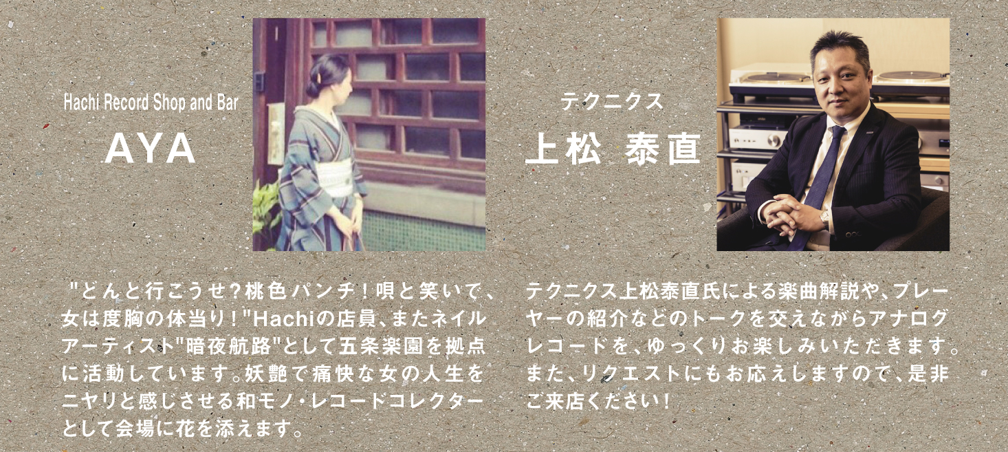 当日はHachi Record Shop and BarのAYA氏、Technicsの上松 泰直氏がMCでご登壇予定。