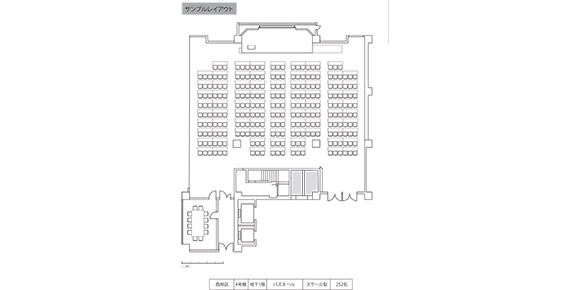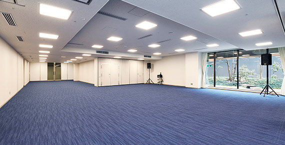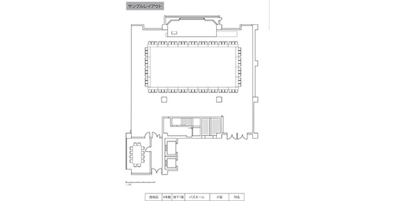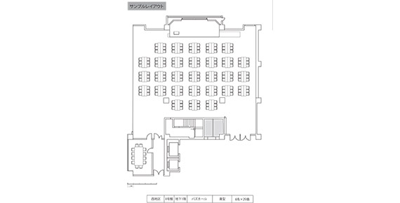 | 設備 | 2ヶ国語同時通訳ブース併設 演台:1台 看板バトン:6,010mm(直径46mm) 電源:1,500W(100V15A)×22回路 ホワイトボード:1台 インターネット:有線 / Wi-Fi ステージ:W8,500×D3,200×H450mm |