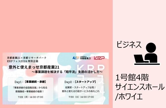 KRPフェス202407/29 (月)07/30(火)終了京都産業21×京都リサーチパーク主催、KRPフェス2024 特別企画! 意外と使えまっせ京都産業21~事業課題を解決する「翔平流」支援の活かし方~ -