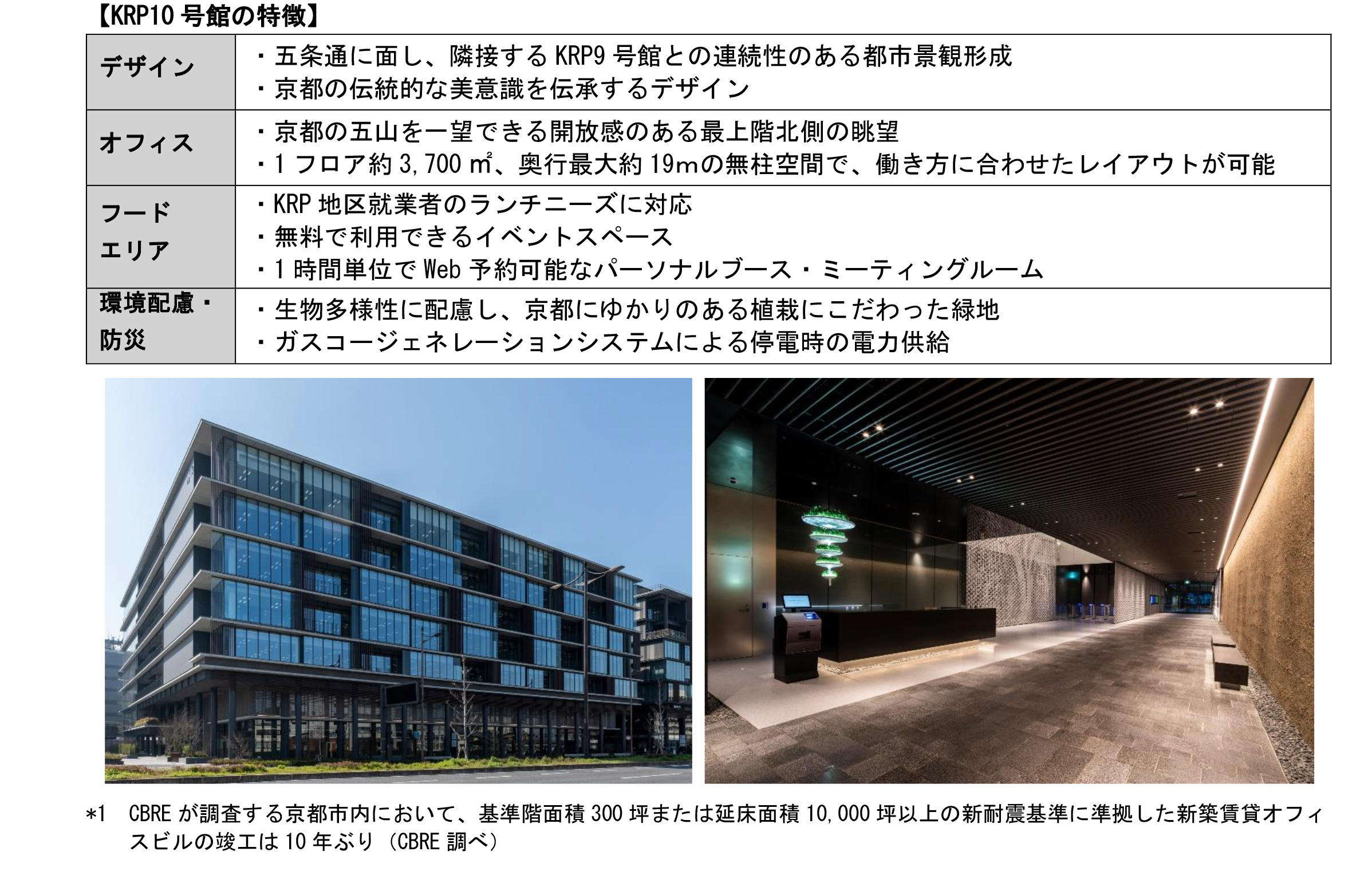 大阪ガス都市開発株式会社(本社:大阪市中央区、代表取締役社長:友田泰弘)は京都リサーチパーク株式会社(本社:京都市下京区、代表取締役社長:小川信也、以下、KRP)が運営する京都リサーチパーク地区(以下、KRP地区)において開発を進めてきたKRP10号館を2021年2月26日に竣工しましたのでお知らせします。KRP10号館は、1階から7階のオフィススペース、1階北側五条通沿いのフードエリア、地下駐車場(86台)で構成され、京都ゆかりのデザインを採用した複合施設です。なお、京都市内では10年ぶり(*1)となる大規模賃貸オフィスビルの供給となります。また、KRPは1階フードエリアに新たな交流の舞台となる「GOCONC(ゴコンク)」をオープン。「魅力的な交流の舞台」を提供します。