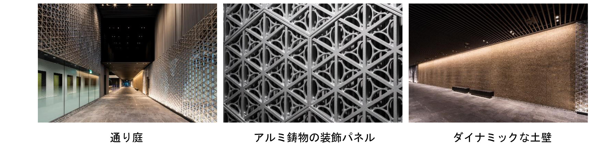 エントランスホールの中央に設置したアルミ鋳物の装飾パネルは、「麻の葉文様」と「四季の草花文様」で構成したデザインとし、京都市内を流れる川と四季の移ろいを表現しています。壁面装飾のコンセプト作成および文様の選定は、地方独立行政法人京都市産業技術研究所の協力を仰ぎ、原型制作・鋳作は大同元年(806年)創業の株式会社傳來工房に依頼しました。また、ダイナミックな土壁、和紙の装飾壁やサインなど、伝統的な材料を用いて現代的にデザインし、豊かな空間体験を紡ぐことを目指しました。