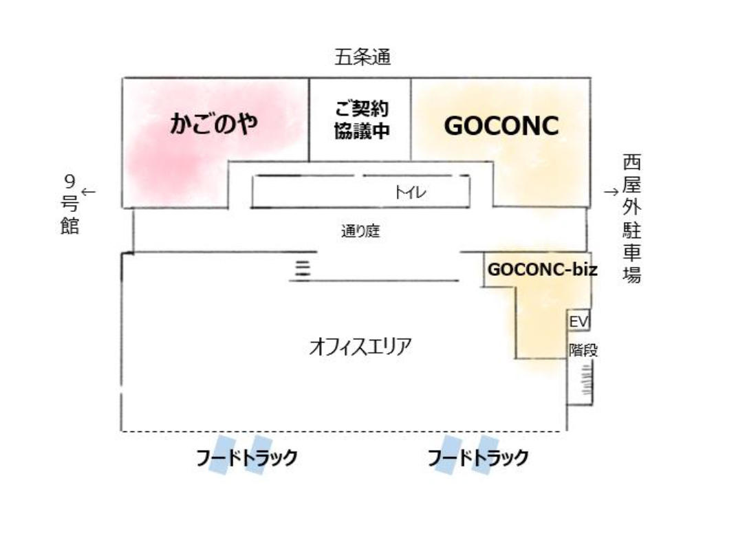 1階フードエリアには、KRPが運営に関わるフードサロン「GOCONC(ゴコンク)」と株式会社KRホールディングスが運営する「かごのや」の2店舗が出店します。また、建物南側にはフードトラックが複数台出店する計画です。KRP地区就業者や来訪者、近隣の方々にとって、飲食、懇親など、気軽なコミュニケーションにご活用いただけるスペースです。
