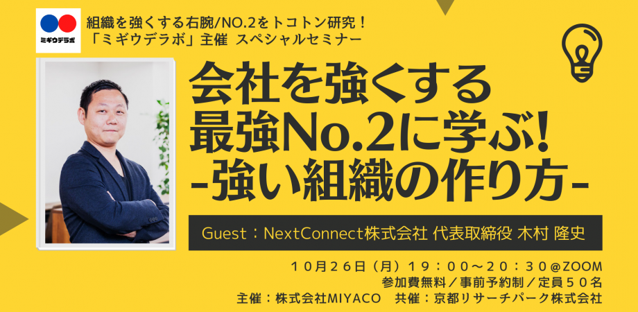 組織を強くする右腕・No.2を研究するミギウデラボ主催のスペシャルセミナーです!今回のゲストスピーカーはNext Connect株式会社代表取締役の木村隆史さんです。木村さんはオーストラリアの大学を卒業後、外資企業、上場企業などあらゆる会社で働き、5年前から元日本代表、本田圭佑選手所属会社(HONDA ESTILO株式会社)に入社。現在は本田選手も関与しているNext Connect株式会社の代表も務めながら、並行してSOLTILO㈱の代表を務める藤井純一氏(*)の右腕として組織を支えている。経営戦略、法務、人事などあらゆる面から会社を支え続け、新規事業から新会社までを軌道に乗せる全てを完璧にこなすビジネスマンとして活躍している木村さんと組織を強くするNo.2の役割について本音で話し合う90分です!