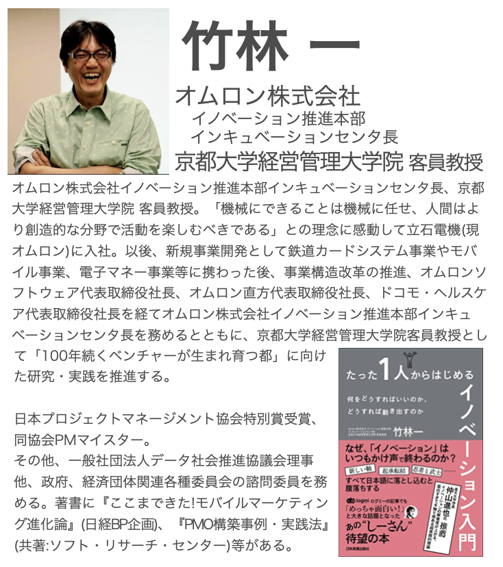 2月開催のスペシャルスピンオフセミナーのゲストは、イノベーションのことならこの方!の竹林 一さんです(オムロン株式会社イノベーション推進本部インキュベーションセンタ長 | 京都大学経営管理大学院 客員教授)。