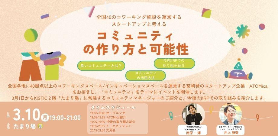 同社が各地で実践してきたコミュニティづくりの要点などをご紹介いただくとともに、ATOMica×KRPで新しく始まるコミュニティ構築の取組、3月1日からKISTIC2階「たまり場」に常駐する新コミュニティマネージャーの紹介などもお話します!