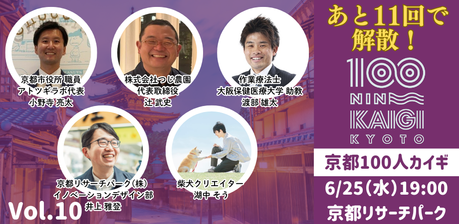 「京都100人カイギ」では、京都で面白いことをしている人や、ちょっとユニークな生き方・働き方をしている人たちをゲストにお招きし、お話を伺います。毎回5人のゲストが登壇し、合計100人が登壇した時点(20回目)で解散します。